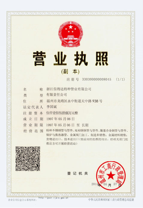 公司已全面通過了ISO9001:2008質量管理體系認證、14000環境管理體系認證、18000職業健康管理體系認證、國家質量檢驗檢疫總局A2-B類壓力管道元件制造許可、 歐盟PED認證及德國AD-2000產品強制認證、美國ASME材料產品認證、信得達擁有1條穿孔生產線,10條冷拔生產線8條冷軋特種無縫鋼管生產線。